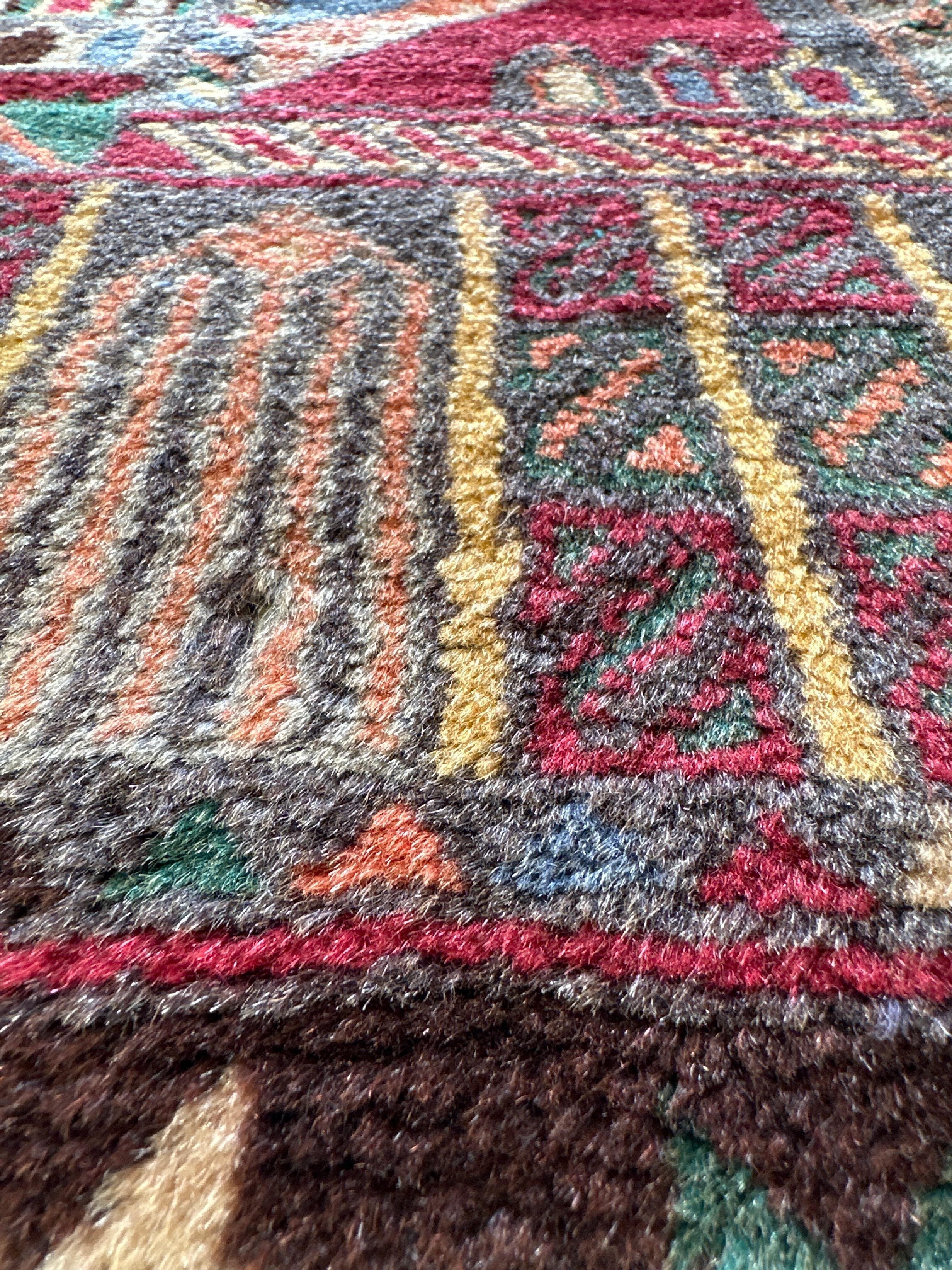この絨毯は特に、その美しい色合いが魅力です。自然由来の染料を使用し、経年変化を楽しむことができます。また、手織りのため、一つ一つのパターンや模様が独自で個性的です。お部屋のアクセントとして、また足元を華やかに演出するために最適です。